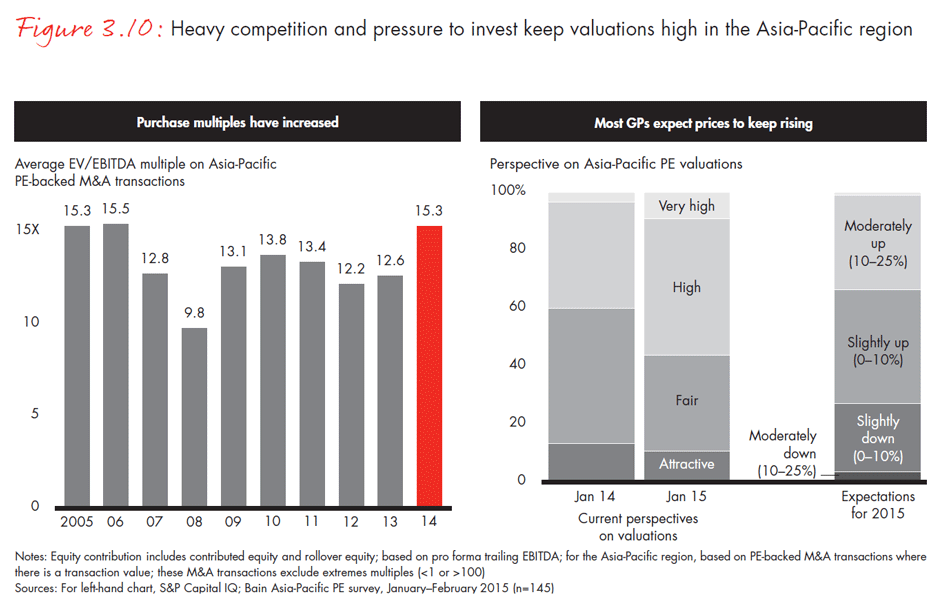 Increasingly intense competition, of course, pushes asset prices higher, making it more difficult to find and justify suitable investments. It doesn’t help that robust equity markets in various Asia-Pacific markets also have tended to support higher multiples. If that fueled the surge in exit activity last year by lifting the IPO markets, it also emboldened sellers to demand higher prices—a trend that, if it were to continue unabated, could dampen deal making. All told, the average multiple of enterprise value to EBITDA for Asia-Pacific PE-backed transactions last year was 15.3. This was up 21% from 2013 and was 59% higher than the 9.6 average multiple in the US market registered for buyouts only, in the first half of 2014 (see Figure 3.10).