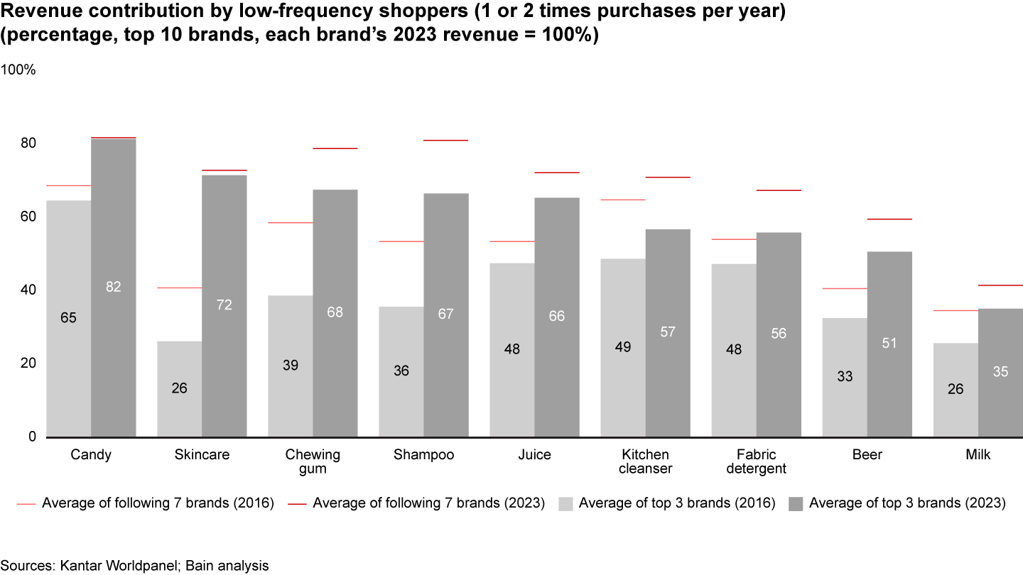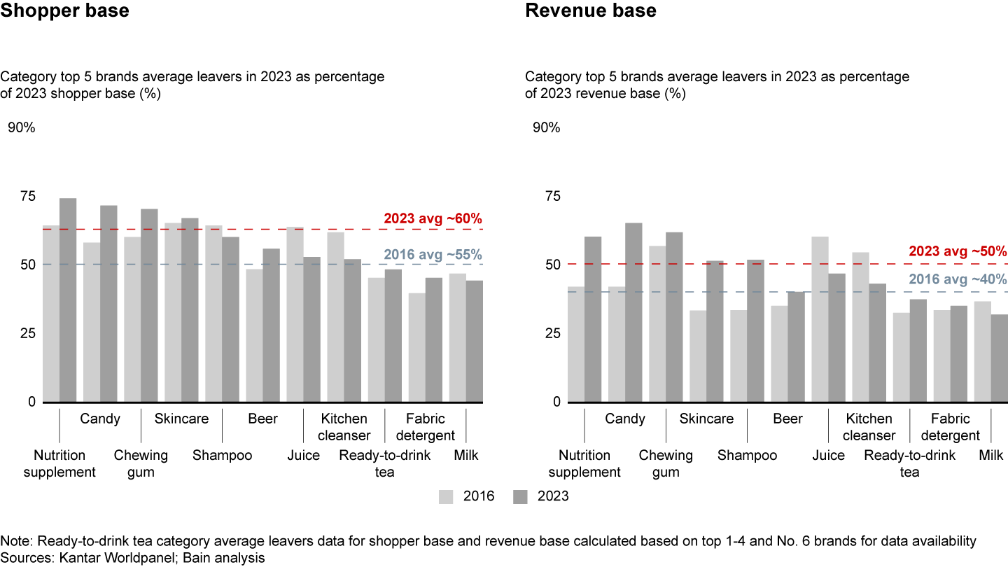 - Thus, the shopper base for brands resembles a “leaky bucket,” particularly for smaller and nonleading brands. Consequently, brand teams must prioritize the continuous recruitment of new consumers to expand their shopper base.