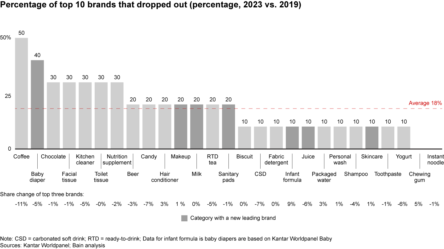 - Markets remain highly competitive, with a significant share of market potential still up for grabs. Among the 27 categories studied, an average of 18% of the top 10 brands dropped from the list in 2023 compared to 2019.