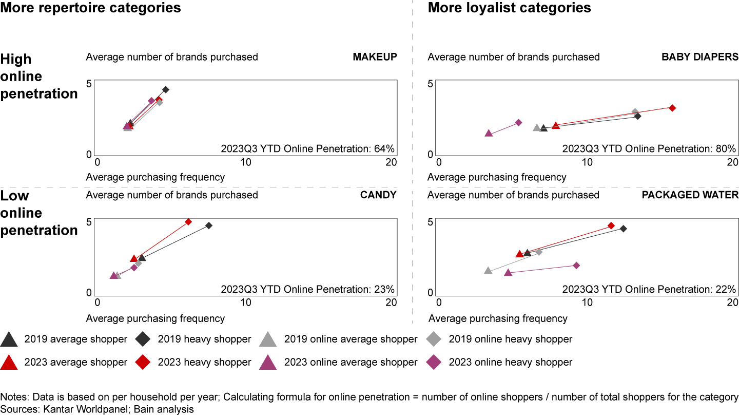 - Online penetration has minimal impact on either repertoire or loyalist shopper behavior. This holds true across both categories with high online penetration, such as baby diapers and make-up, and categories with low online penetration, such as candy and packaged water.