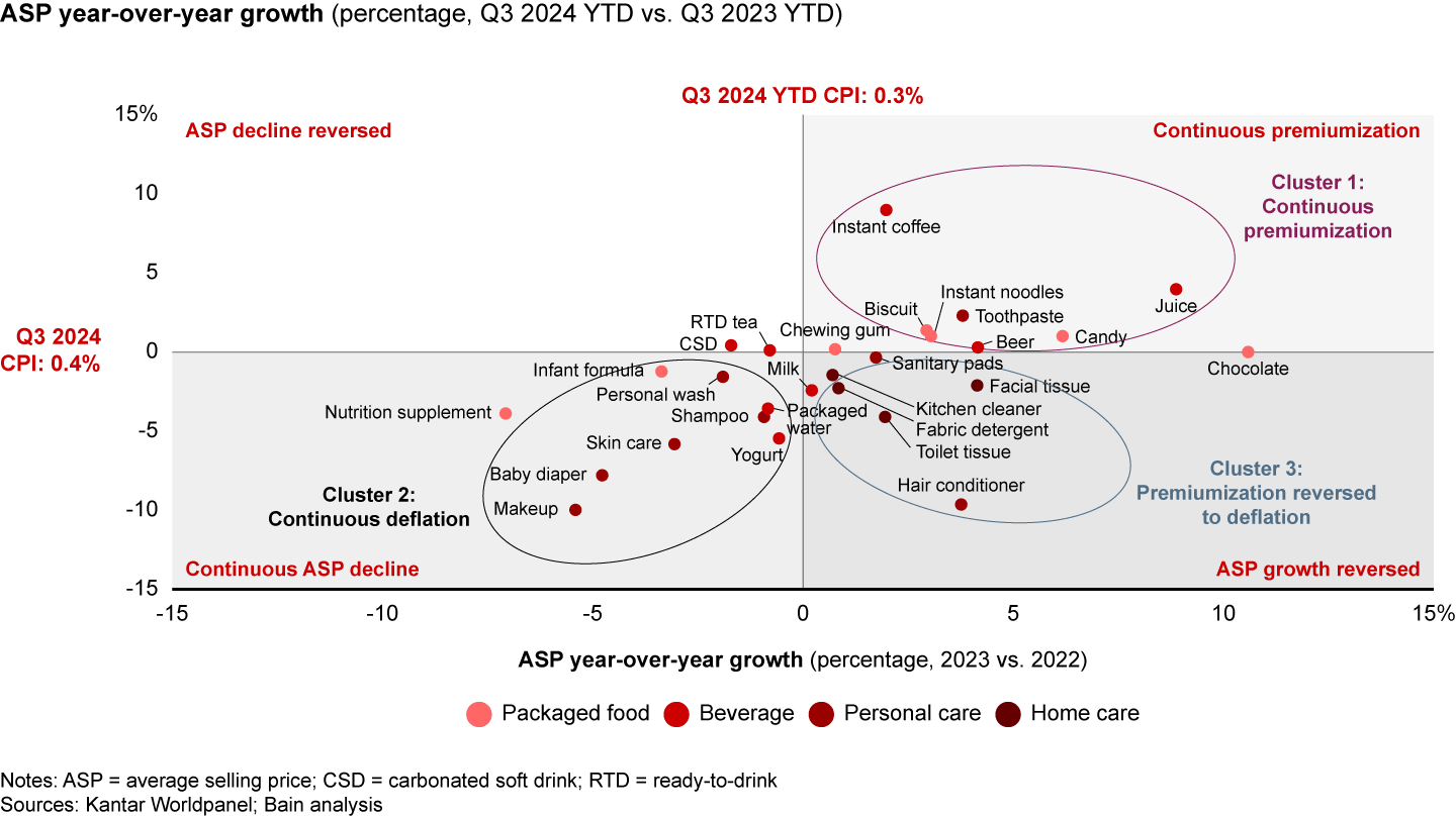 Trade-up: Among the 27 categories tracked, 9 did not experience a drop in average selling price (ASP). Most of these categories maintained a flat ASP, with changes between 0% and 1%. Only juice, instant coffee, and toothpaste saw increases exceeding 1% in ASP. This growth can be attributed to rising demand for health and wellness products, along with innovations within the categories. For example, the juice category experienced heightened demand for higher quality and richer flavors, with coconut water emerging as a rapidly growing subcategory. Instant coffee also benefited from innovations such as freeze-dried instant coffee pods.