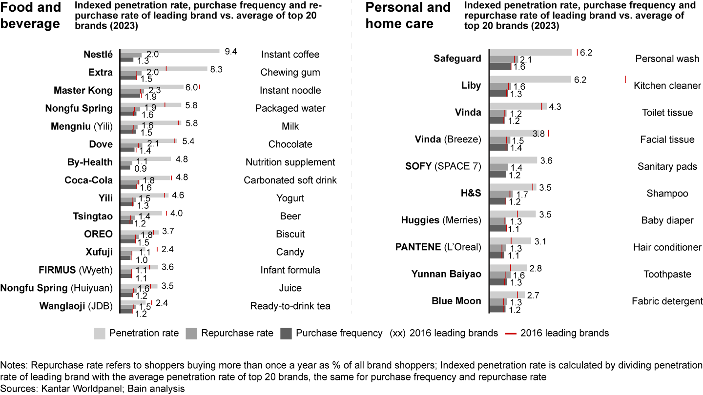 Market leadership is determined by a brand’s ability to boost and maintain household penetration, defined as the percentage of households in a market that purchase a particular brand within a year. As we explained in China Shopper Report 2014, Vol. 2 (Chinese Shoppers: Three Things Leading Consumer Products Companies Get Right), the key to growing market share is increasing penetration. This insight stems from research conducted by the Ehrenberg-Bass Institute for Marketing Science, summarized by Professor Byron Sharp, the Institute's director, in his book How Brands Grow, which is based on decades of observations of buying behavior. Furthermore, Bain & Company and Kantar Worldpanel shopper reports have validated this finding in China over the last 10 years specifically, (shopper reports looking at consumer behaviors in 2013, 2016, and 2019), even as online channels became more and more prevalent for consumers.