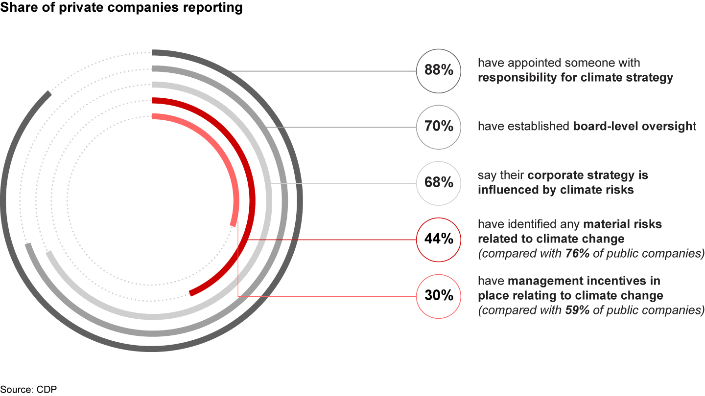 A majority of private companies have assigned oversight for climate strategy, but far fewer are identifying risks or incentivizing action