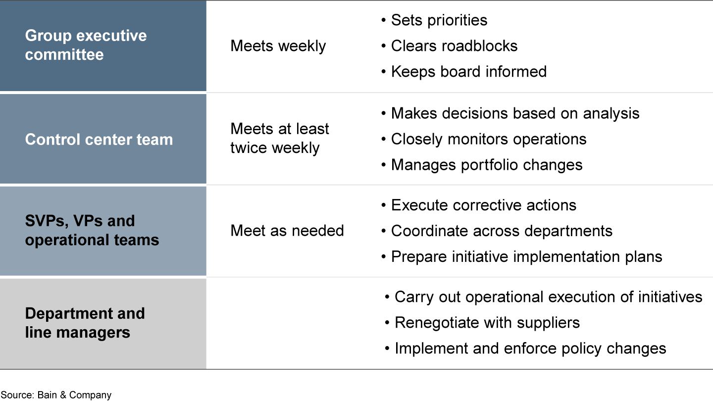 In a time of crisis, one of the most important actions that executives can take is to approach decisions in a calm and fact-based manner, acting now where they can, and planning now for actions they can take later. Senior executives have to step up to make more decisions—and more quickly—than in normal conditions. The center is the only place where the most difficult trade-offs can be made. Establishing a control center with the authority to make recommendations, monitor key performance indicators and communicate consistently with all stakeholders is a critical priority (see Figure 3).