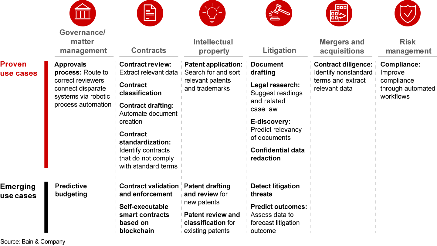 AI’s uses in the legal realm are still being defined, with some more proven than others (see Figure 2). For instance, predictive insights about the likelihood of litigation makes for better informed business decisions. Software can spot and mitigate risks in business processes. AI provides faster, less expensive means to deal with e-discovery, compliance monitoring and e-billing. And with AI still in early stages, the potential value of digital tools will only grow.
