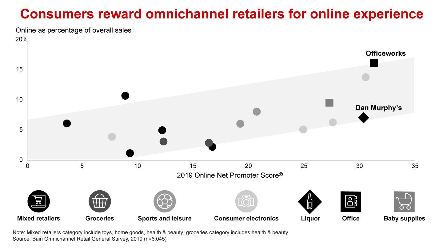 Customer experience matters. Bain’s research shows that Australian omnichannel retailers’ online sales are highly correlated with their online Net Promoter Score®, which improves dramatically when customers shop in both channels.
