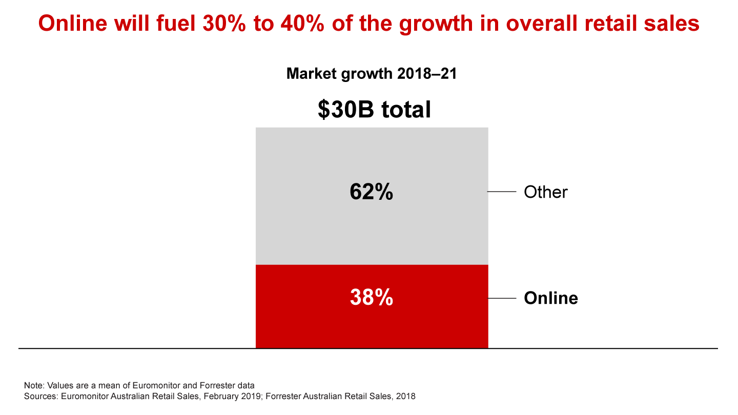 Online retail is the growth bright spot in Australian retail. Growing at more than six times the rate of brick-and-mortar, it is expected to account for 30% to 40%, on average, of incremental market growth over the next three years, according to Forrester and Euromonitor.