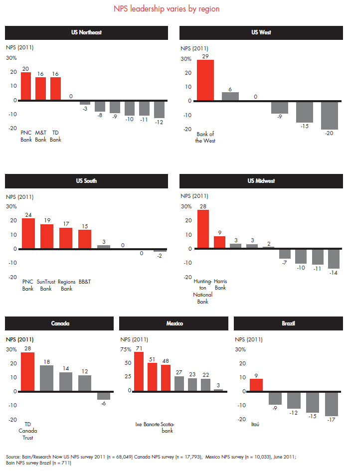 • Some regionals have been demonstrating strong improvement over time. Of the 18 national and regional banks in the Bain 2011 survey, two out of three registered a higher NPS than they did a year ago.