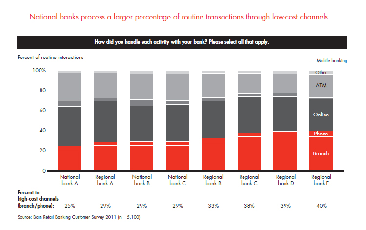 Though better than their smaller peers at using technology for basic customer interactions, even the big regional and national branch banks remain too reliant on high-cost channels for taking deposits, handling withdrawals and fielding common balance inquiries. Bain research has found that the customers of some of America’s biggest banks rely on branches and call centers to handle between 25 percent and 40 percent of their routine transactions.
