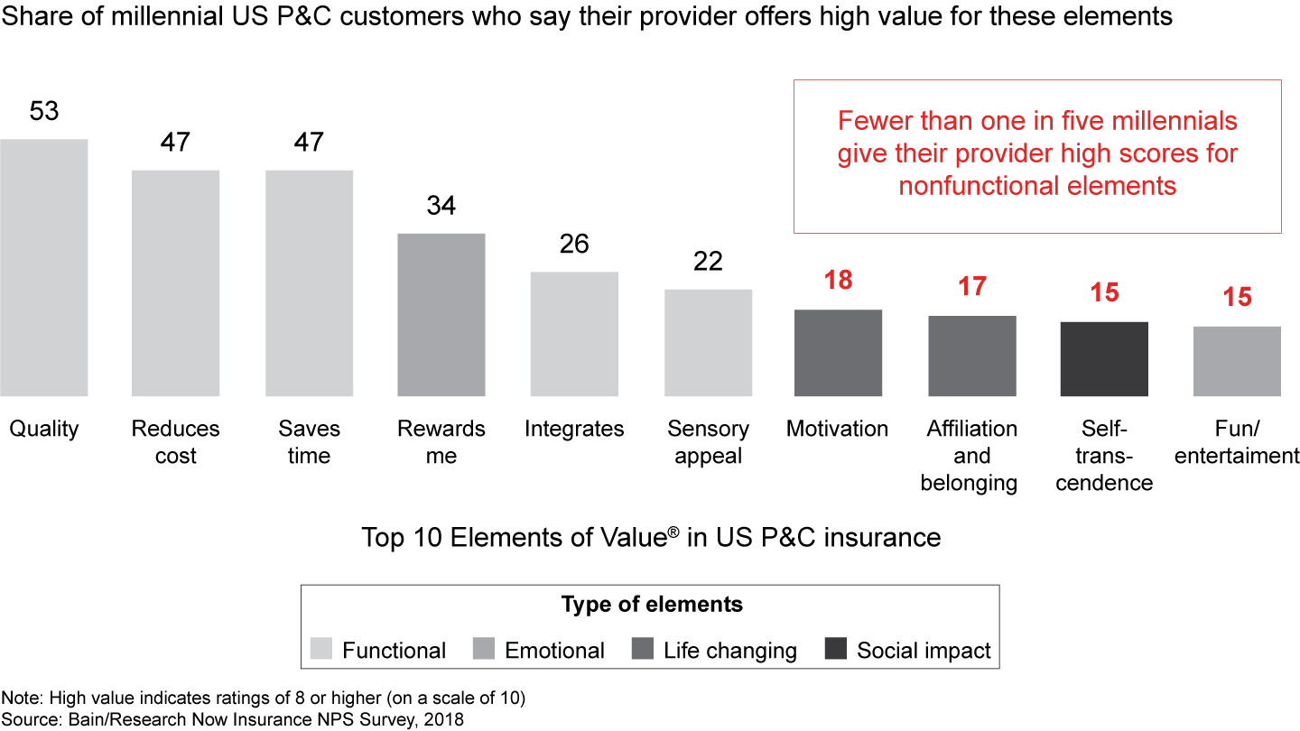 - Loyalty scores soar when insurers deliver on the Elements of Value that matter most to their customers. In both life and P&C insurance, the more elements customers rate highly, the greater the Net Promoter Score. Customers who award high ratings to five or more elements generate a score that is as much as 80 points higher than those customers who award high ratings to only one or two elements.