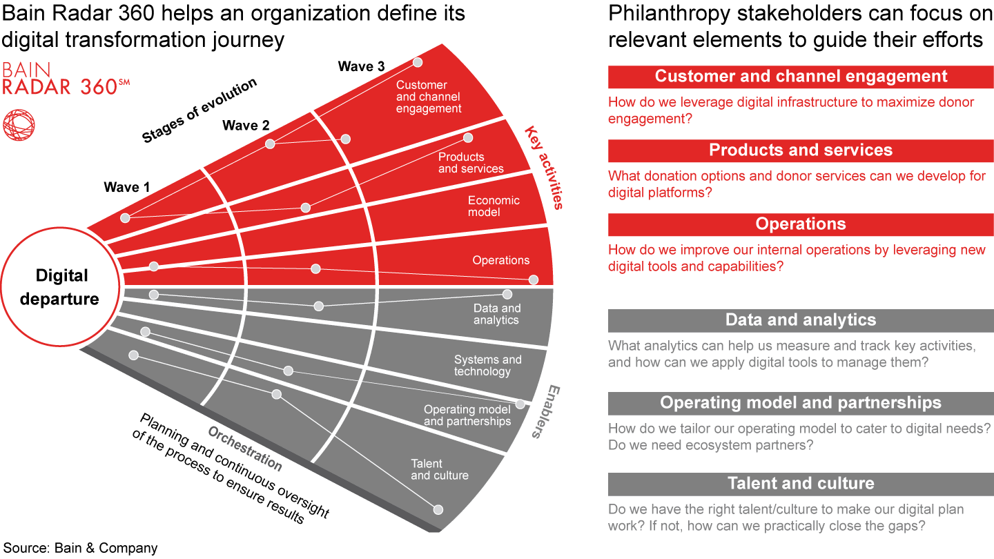There is no single path to success, but based on our study and the Bain Radar 360 SM framework, philanthropy stakeholders should ask themselves a set of key questions as they begin to develop their digital strategies.
