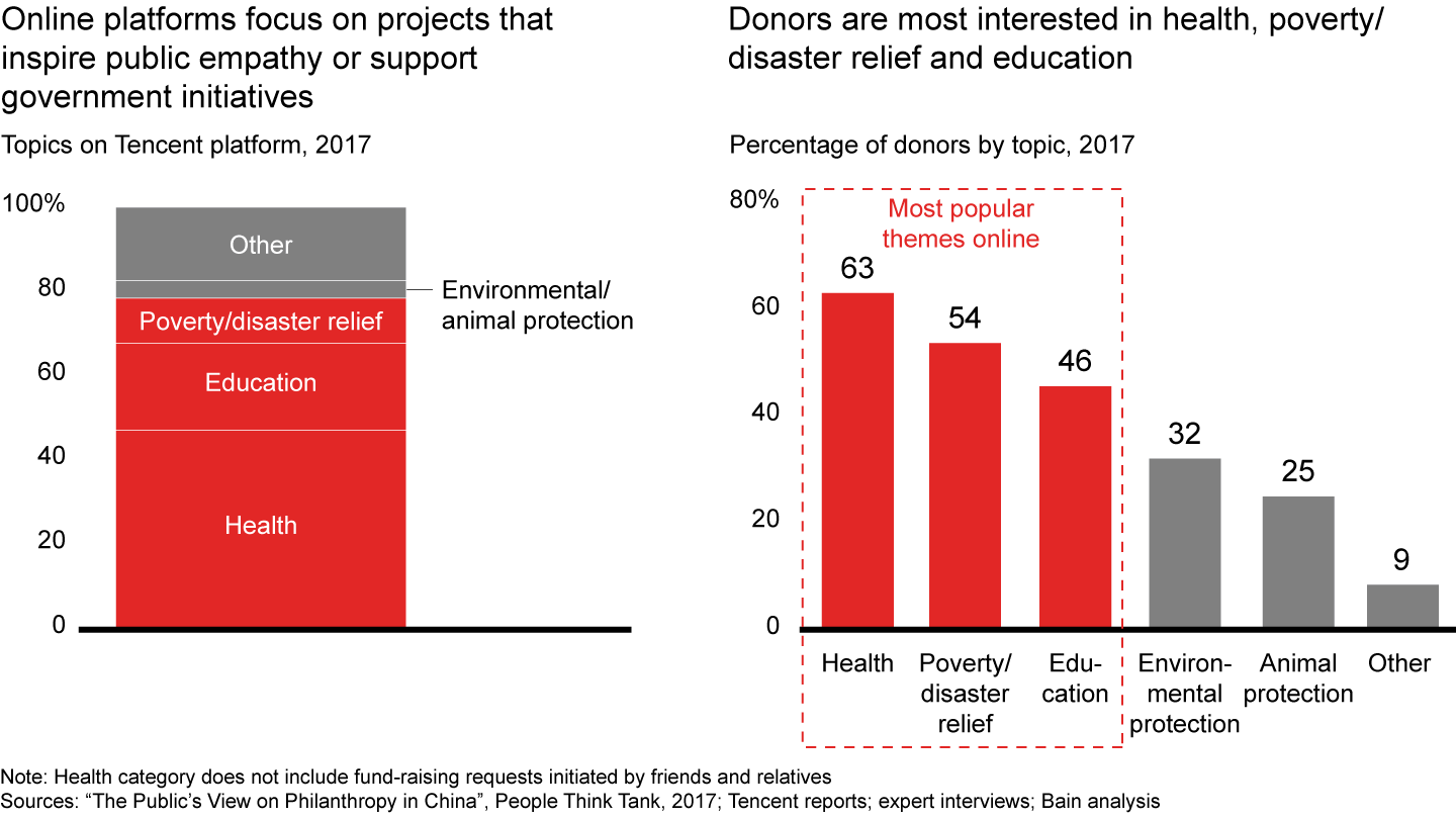- Overall, digital philanthropy in China today is characterized by a few key attributes. Young people are the major donor group online, and engaging young donors will be an important battle for all stakeholders. We also find that platforms are encouraging NGOs and individuals to fund-raise online, and that a relatively small percentage of projects are capturing the bulk of the donation value. In addition, health, poverty alleviation and education are the most popular themes of online projects.
