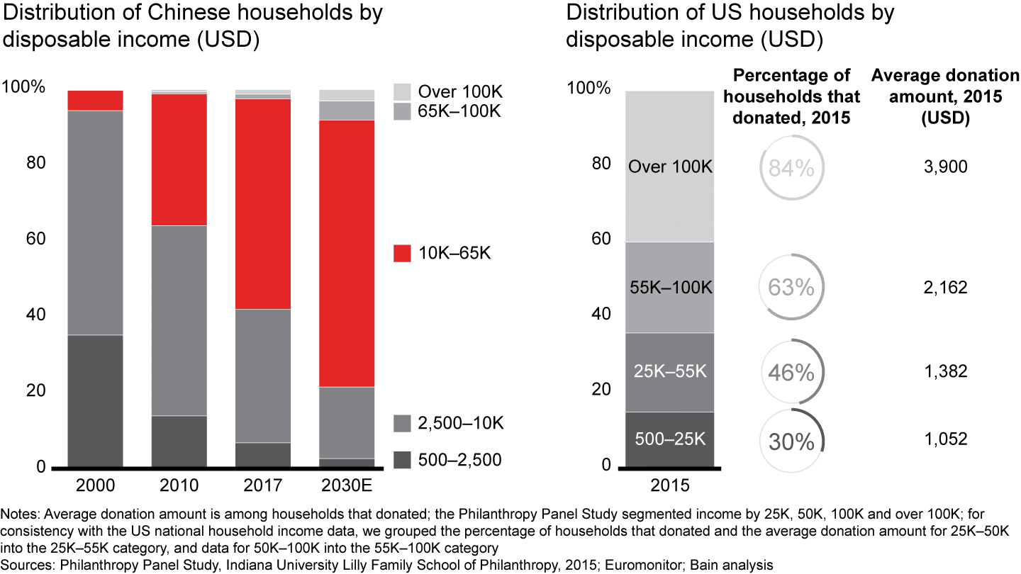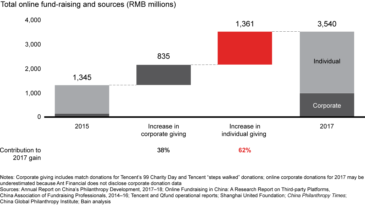 Total charitable donations in China reached RMB 156 billion in 2017, having grown at a compound annual rate of 11% from 2011 to 2016. China’s philanthropic sector has developed primarily through corporate giving, which contributes approximately 60%–70% of total donation value, while donations from individuals make up about 20% of the total market. Although China has the fourth-largest number of individual donors in the world (91 million in 2016), this represents only 7% of the Chinese population, suggesting significant room for growth.