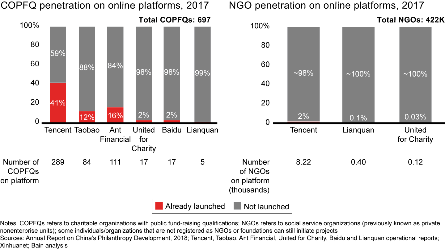 - Currently, the landscape is highly concentrated; 20 online platforms are licensed to link individual donors to projects, but 90% of total donation value goes through Alibaba and Tencent. However, competition may intensify as other players apply for licenses to participate