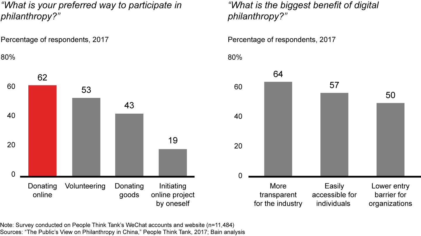 - Digital philanthropy in China is still in its infancy, and there will be no single path to success in the market. As stakeholders assess the opportunity, it is important for them to ask several key questions, with a focus on how they will engage customers, manage operations, leverage data and analytics, and grow their internal talent pool.