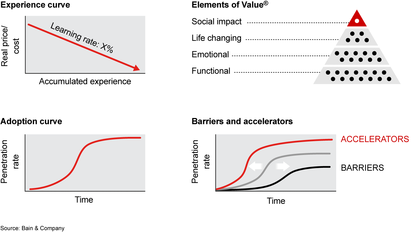 • A barriers and accelerators analysis asks what’s getting in the way of this innovation taking over the market and when that might be eliminated so adoption can accelerate. Conversely, is anything imminent—regulation, incentives, political developments—that could become a catalyst for faster adoption?
