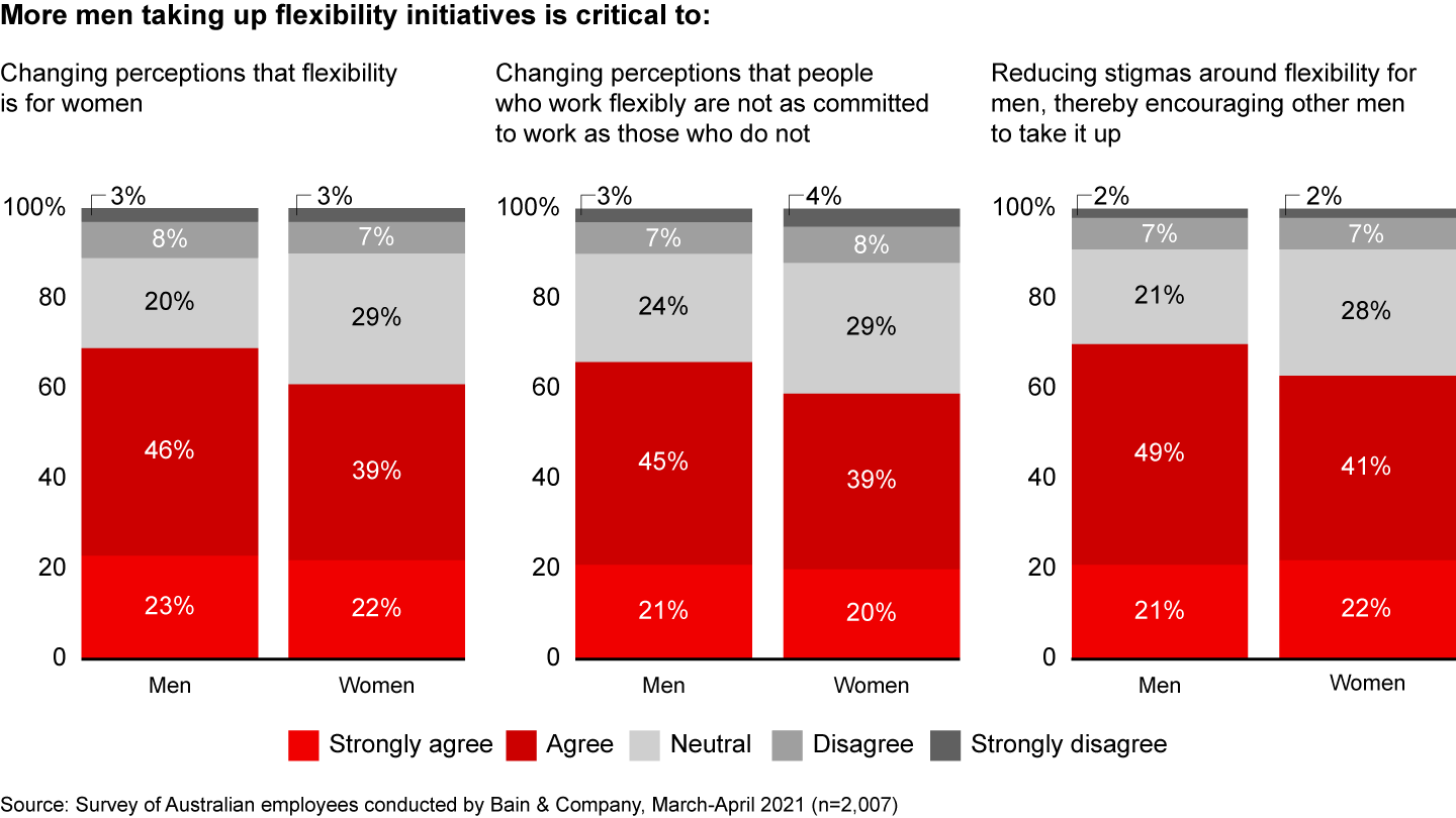 Both men and women agree that men taking up flexibility initiatives is critical to making flexibility less detrimental to those who take it. Nearly 70% of respondents (and 70% of men) said men’s participation is critical to reduce stigma around flexibility and encourage participation (see Figure 5).