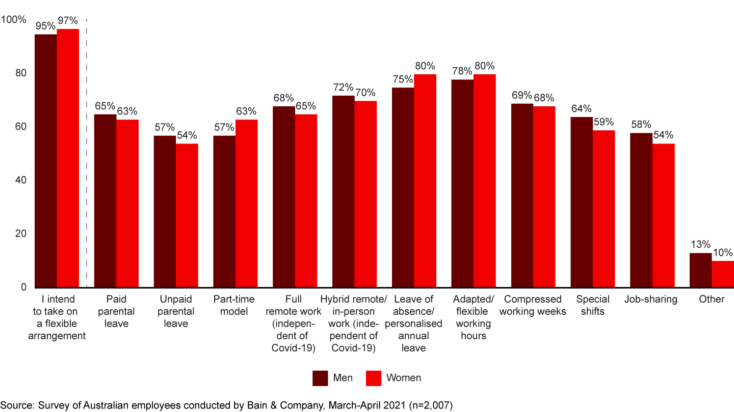 - Employees want more flexible work options to continue. 57% of women and 66% of men said they expect their workplace to become more flexible after the pandemic subsides. 95% of respondents indicated they would take a flexible arrangement in the next three years if offered by their organisation (see Figure 1).