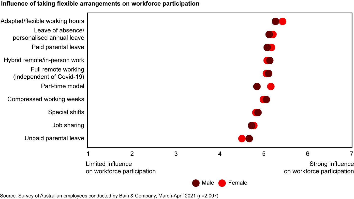 Adopting flexible practices in aggregate encourages workforce participation among workers who would otherwise find it too costly to work or to invest in workplace skills. Our survey found that all flexible arrangements had an influence on workforce participation (see Figure 2).