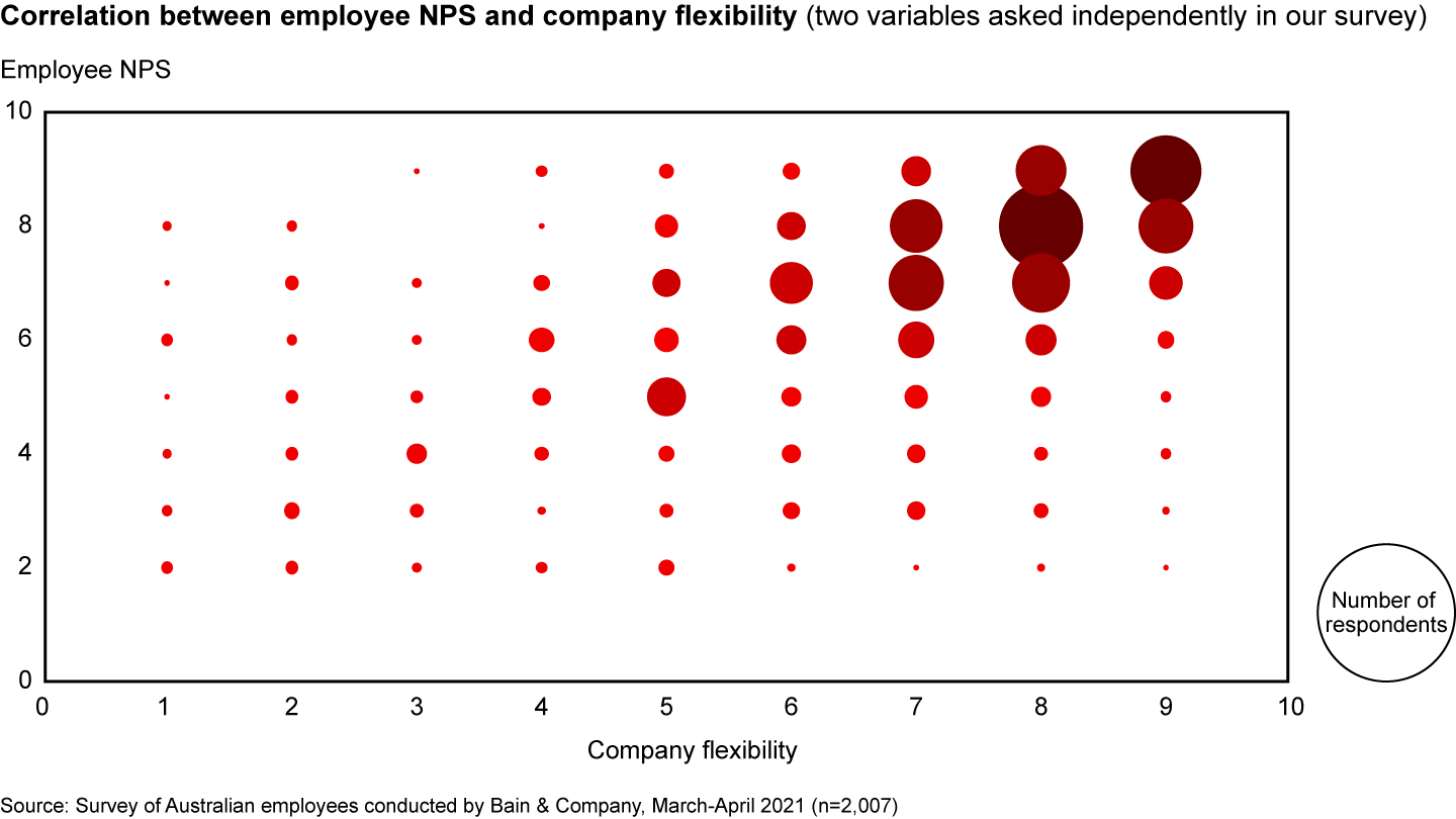 This survey found a strong correlation between employees’ assessment of their companies’ flexibility and their eNPS (see Figure 3). That is important because employees with a high eNPS are more productive and stay longer. Flexibility helps attract, retain, and inspire employees, and thereby, when leveraged equitably and at scale, has amplified returns.