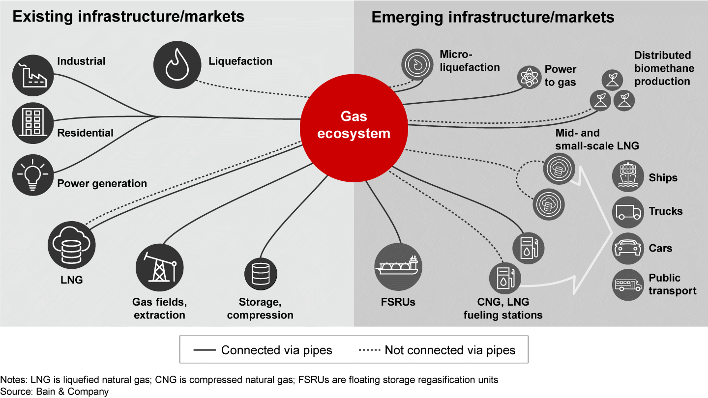 While the essence of the midstream business will remain the same—namely, connecting supply with demand through the development, operation and maintenance of infrastructure—a changing landscape creates new opportunities for TSOs (see Figure 3). The energy transition will expand the traditional scope of midstream infrastructure, from biomethane plants upstream to natural gas fueling stations and small-scale LNG assets downstream. Decarbonization promises to boost consumption of natural gas, leading to more capital investment that will sustain midstream’s core infrastructure business.