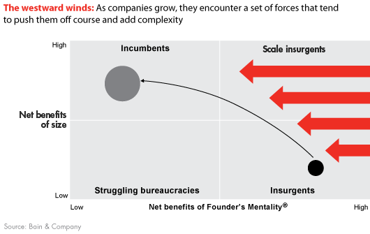 As insurgent companies gain scale and scope, they can easily succumb to a number of forces—we call them the four westward winds—that push them to become more like the dominant incumbents in their industries. The best companies maintain or regain their Founder’s Mentality® by resisting those forces.