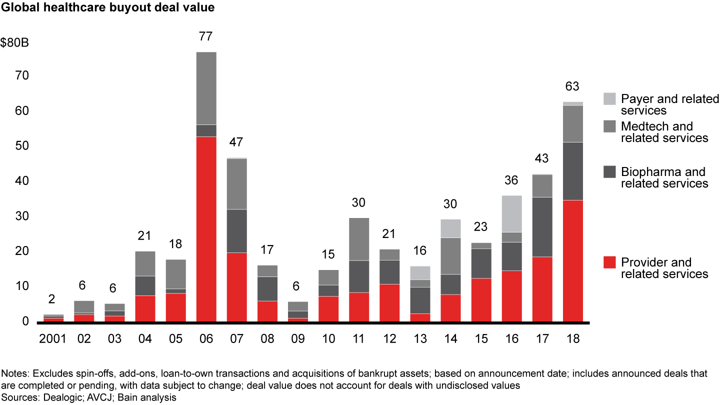 This article is part of Bain’s 2019 Global Healthcare Private Equity and Corporate M&A Report. Explore the contents of the report here or download the PDF to read the full report.