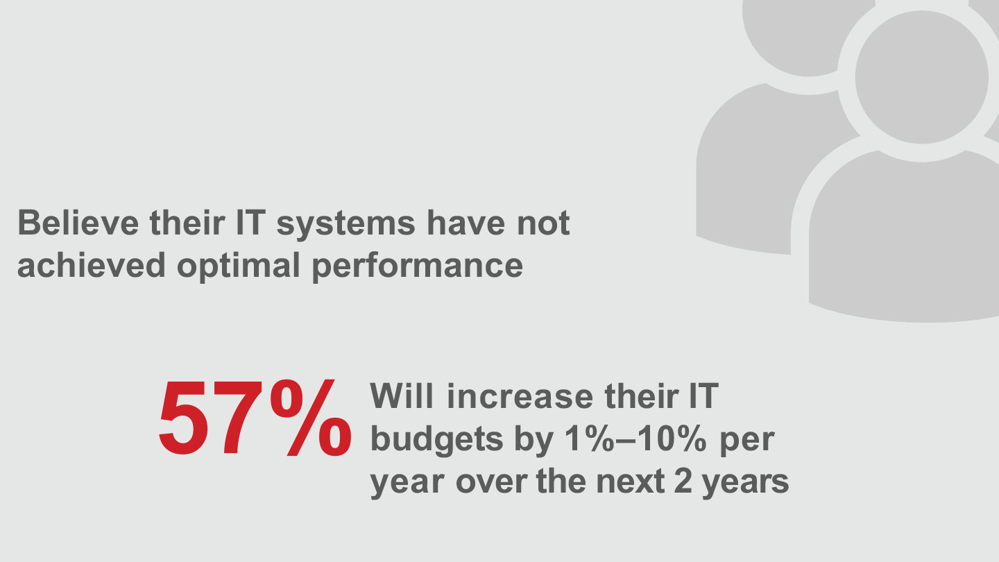 HR departments that find themselves falling behind can take solace in the fact that the digital transformation is still in early stages, so they can still catch up. Some 87% of respondents believe that digital will fundamentally change HR, but 75% acknowledge that their IT systems and technology have not yet achieved optimal performance or the business outcomes they desire. The window of time may be closing, however, as 57% of respondents plan to increase their IT budgets by 1% to 10% over the next two years, and 25% plan to increase budgets by more than 10% (see Figure 1).