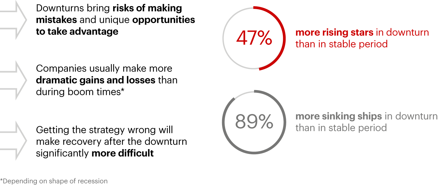Bain’s research consistently shows that companies win or lose the greatest share during periods of turbulence and uncertainty—either because they make mistakes or stay on the sidelines. Crises produce more rising stars and more sinking ships (see Figure 1).