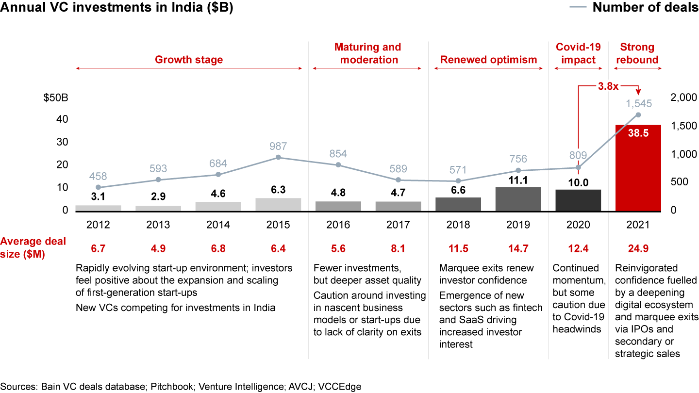 2021 was a pivotal year for the Indian venture capital (VC) investment landscape—a convergence of heady tailwinds coming together in a record growth year as VC funding reached $38.5B with several highlights: