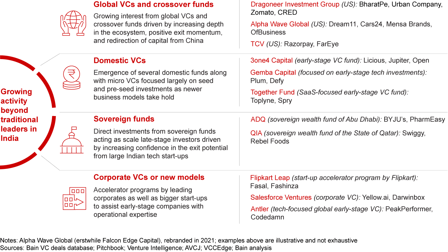 New investors made significant inroads into India in 2021: (a) several Tier 1 global VCs and crossover funds (e.g., Technology Crossover Ventures [TCV] and Dragoneer Investment Group) made large investments, (b) emerging domestic VCs gained presence (e.g., 3one4 Capital), and (c) global sovereign funds (e.g., Abu Dhabi Developmental Holding Company [ADQ], Qatar Investment Authority [QIA]) made direct investments. Sector-focused global and domestic funds doubled down (e.g., Ribbit Capital in fintech or DSG Consumer Partners in consumer tech). Further, traditional PE funds such as KKR or Warburg Pincus also demonstrated an increasing focus on growth equity deals. Most funds have also forayed into offering several portfolio advisory services spanning from recruitment to business development to help differentiate their capital.
