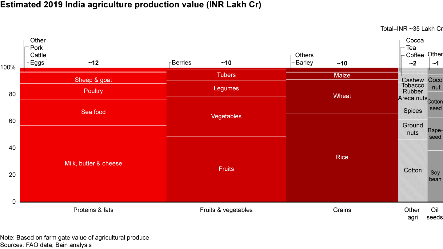 Agriculture is the largest sector in India’s rural economy, contributing INR ~35 lakh Cr to the national GDP in 2019–2020. Proteins, fats, fruits, and vegetables make up 60% of agriculture’s production value (see Figure 2). Rice and wheat cover approximately 40% of India’s land under cultivation and account for a quarter of the total agriculture production value.