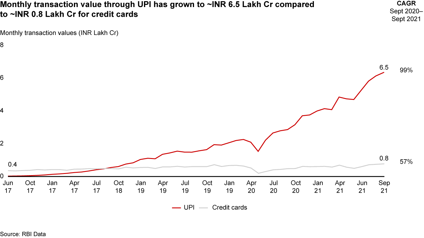 Digital penetration is rapidly increasing, driven by the growth of UPI apps like PhonePe and Google Pay. UPI has grown from almost no transaction volume in 2017 into a dominant payment source. Accelerated by the pandemic, UPI processes eight times more transaction value today than credit cards (see Figure 3). Between April 2020 and September 2021, PhonePe’s monthly transaction value rose from ~INR 0.6 lakh Cr to ~INR 3 lakh Cr. Similarly, Google Pay experienced month-over-month growth of 7% in 18 months, with monthly transaction values rising from ~INR 0.7 lakh Cr in April 2020 to ~INR 2.5 lakh Cr in September 2021.
