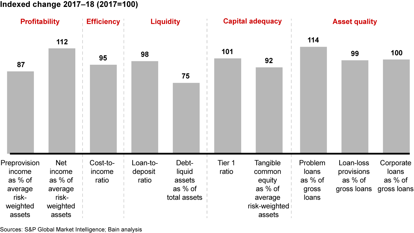 European banks had a mixed year in their overall health. They experienced a deterioration in capital and liquidity across the board by the end of 2018, with five large banks warranting the “highest concern” status in Bain’s latest health check, up from just two of the largest banks flashing that signal. They did, however, on average improve their profitability and asset quality (see Figure 1).
