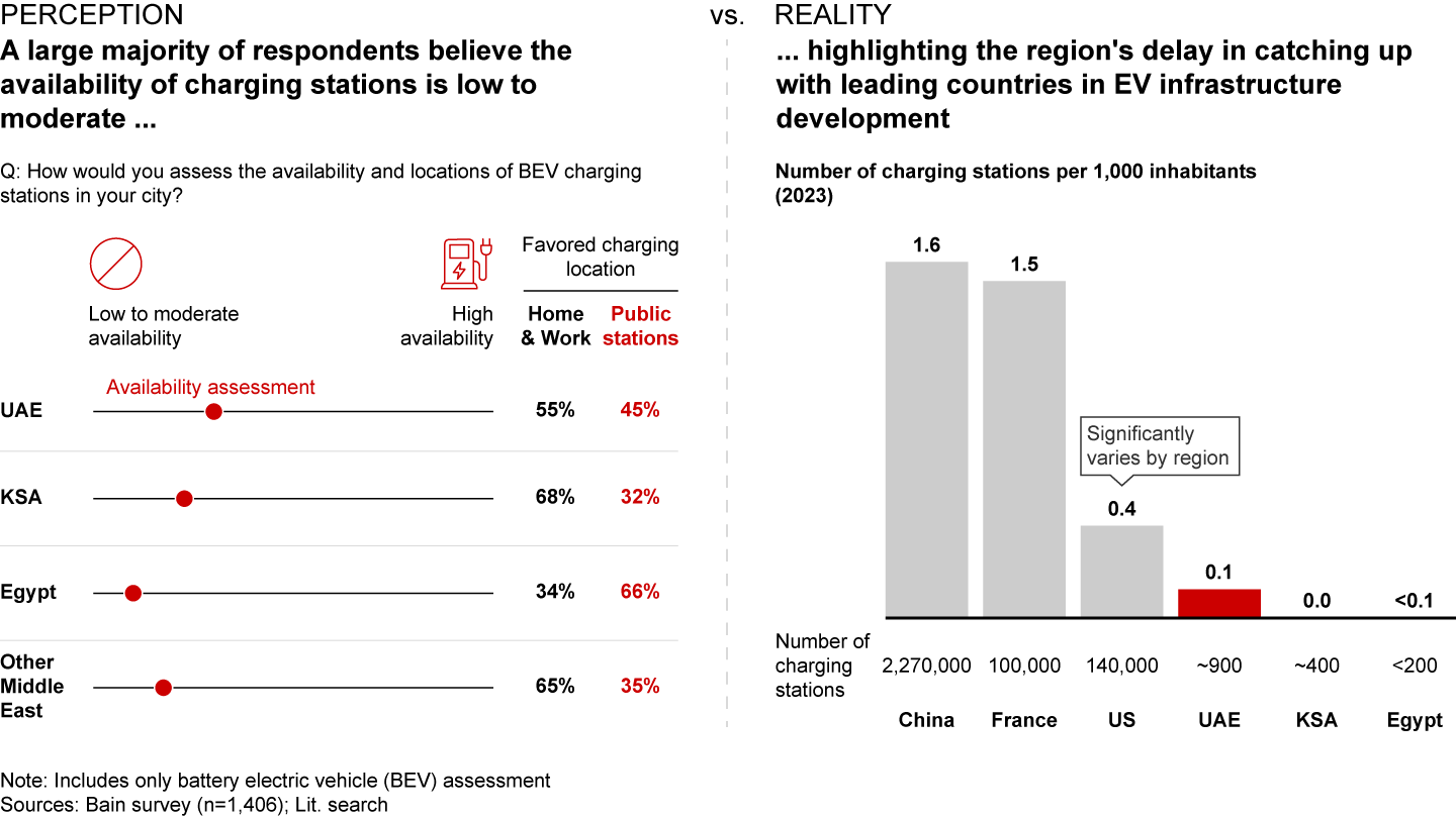 Respondents’ assessment of the availability of charging stations in the Middle East vs. number of charging stations per 1,000 inhabitants by country (2023)