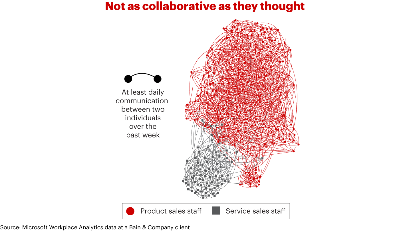 Executives at one technology provider heard from customers about disjointed sales approaches, despite reassurances from the sales staff that they went to market with one voice. The company decided to diagnose whether it had an organizational gap, using Microsoft’s Workplace Analytics software. The chart depicts the intensity of sales staff relationships, as represented by the amount of email traffic between individuals. It clearly shows how little communication was occurring between the two groups. Separate analysis found that more than half of the largest service accounts also bought products, suggesting a major revenue opportunity and a chance to create a better customer experience.