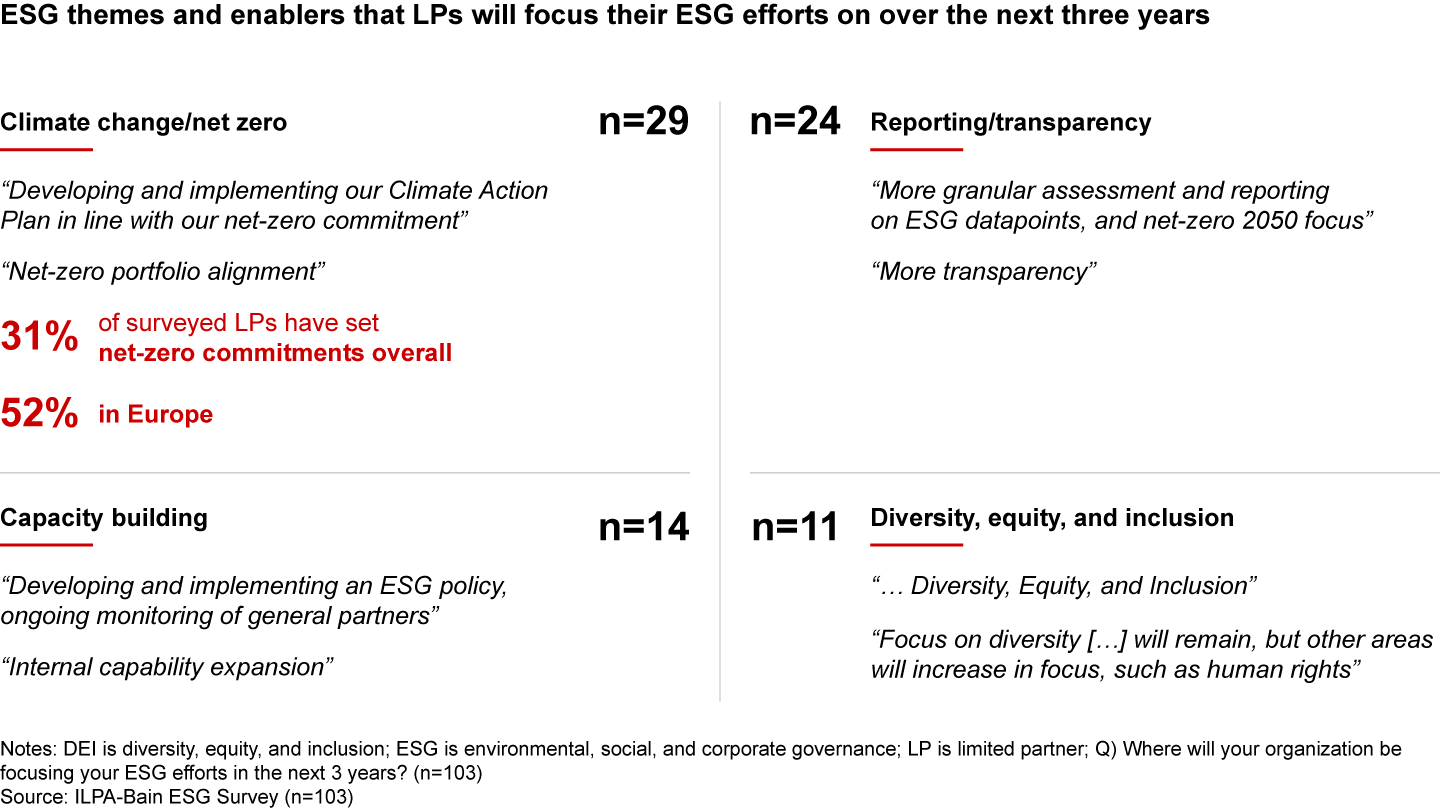 Over the next three years, most LPs will focus their efforts on climate, ESG reporting, internal capacity building, and DEI