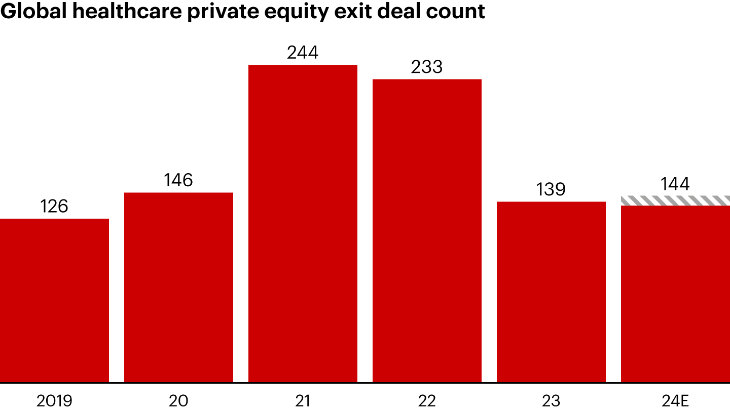 Healthcare private equity (PE) exit deal volume remained low in 2024, down 41% from its 2021 peak (see Figure 1). Interest rates, an uncertain macroeconomic backdrop, and misaligned expectations have resulted in a stalemate between buyers and sellers. Therefore, fewer assets are changing hands, prolonging hold periods and straining funds’ ability to return capital to their limited partners (LPs) (see Figure 2).