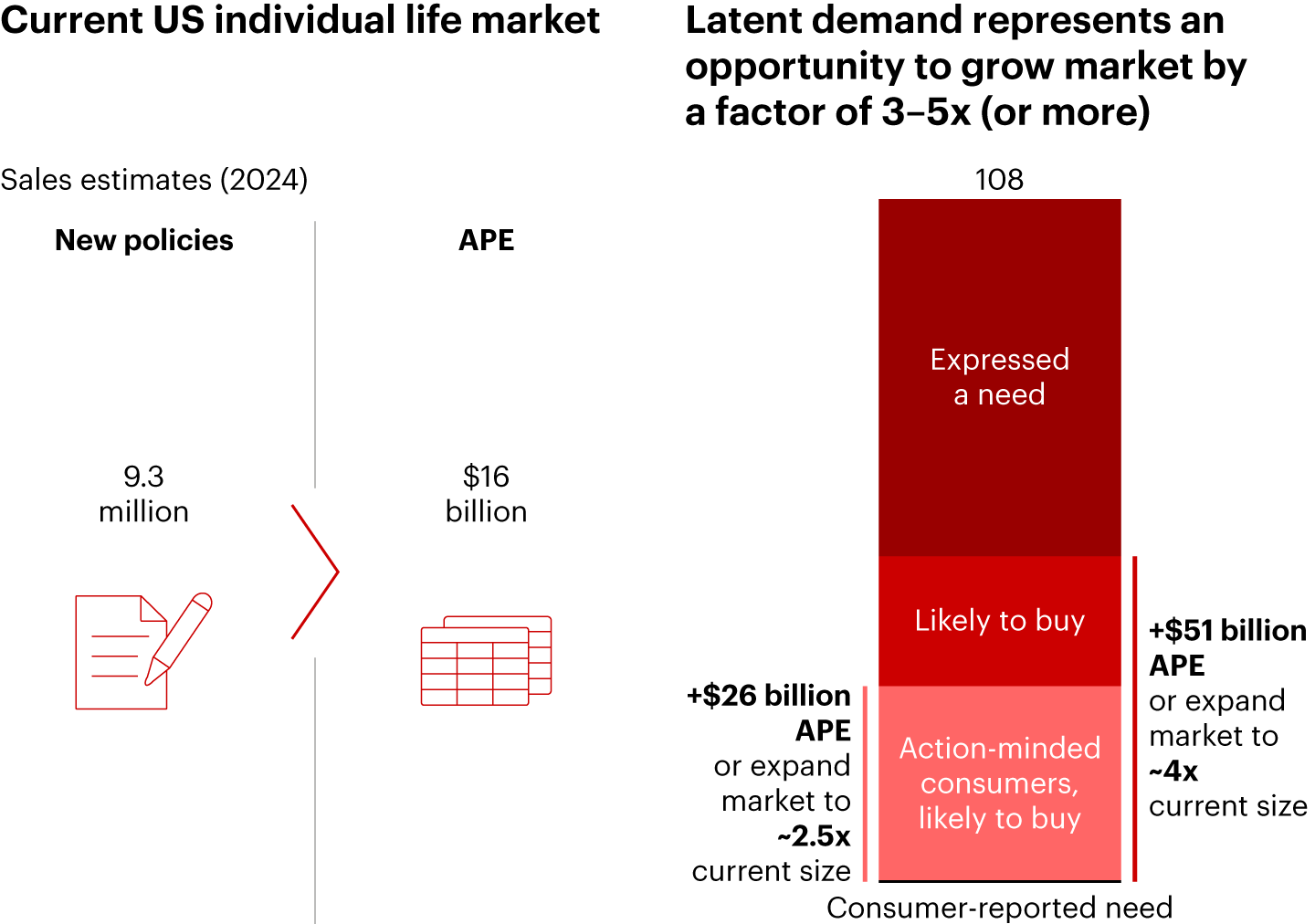 In 2024, 42% of US adults reported not having enough, or any, life insurance coverage despite recognizing a need for it. This need is significant: Half of consumers within the “protection gap” indicate they are likely to buy coverage. Yet they aren’t buying it. Affordability is a genuine challenge, with more than 66% of this group citing cost or other financial priorities as the main reason for not purchasing life insurance. Inflationary environments exacerbate perceived affordability; however, affordability isn’t the primary issue. In reality, the protection gap spans income bands and ages. More than 80% of individuals within the protection gap have at least $50,000 in household income and one third have at least $150,000 in household income. These consumers have relevant buying needs, such as financial dependents or significant life events, that should make them more inclined to purchase. Helping even modest numbers of people meet this need with coverage aligns the industry’s noble mission with its bottom line: protecting more families would spur industry growth (see Figure 3).