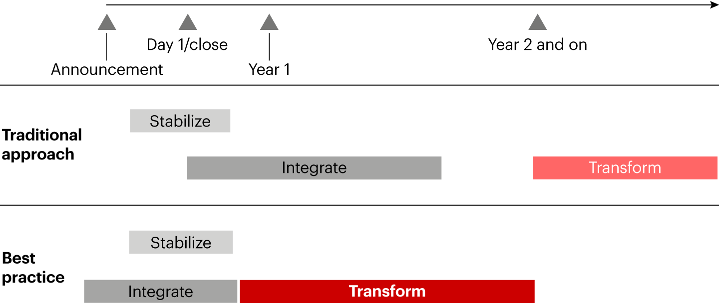 At the same time, this then frees up resources to pursue transformation, which doesn’t happen in most deals in our experience. Or if it does, it’s two or more years after the transaction. The best M&A acquirers pivot to transformation often within the first year of integration.