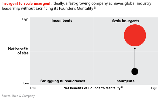 The traditional path of growth—trading the Founder's Mentality of the insurgent for the scope and scale of the global incumbent—threatens that culture. Often, when insurgents accept the trade-off between scale and the Founder’s Mentality, they run the very real danger of drowning under the complexity they've created—sinking into struggling bureaucracies that have not only lost any sense of a Founder’s Mentality but also begin to lose any real net benefits of scale and scope.