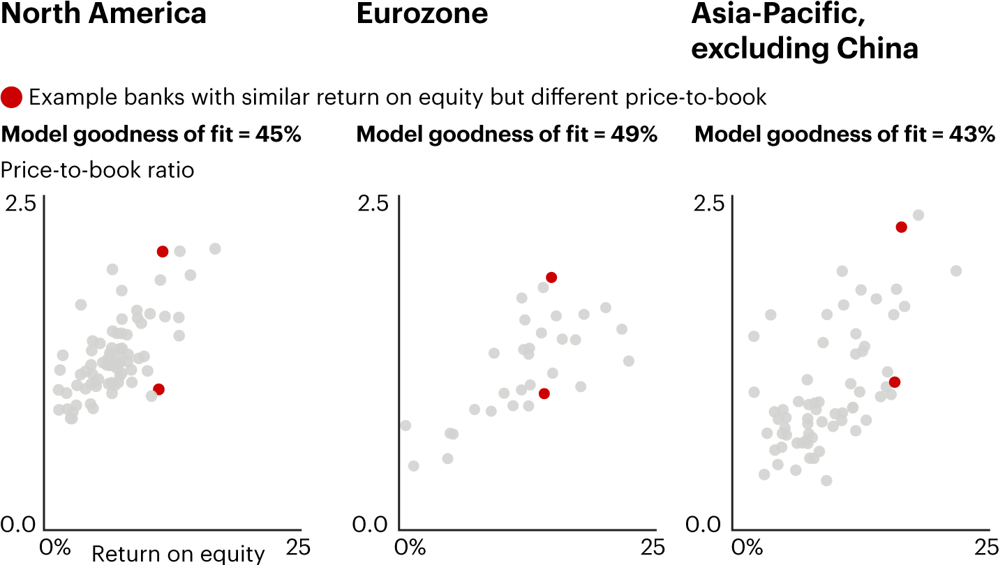 Digging deeper into the components of valuation, most analyses start with ROE as a key performance metric. But ROE tells only part of the valuation story. Bain & Company analysis shows that ROE explains just 43% to 49% of the variation in P/B ratios across banks in North America, Europe, and Asia-Pacific (see Figure 2).