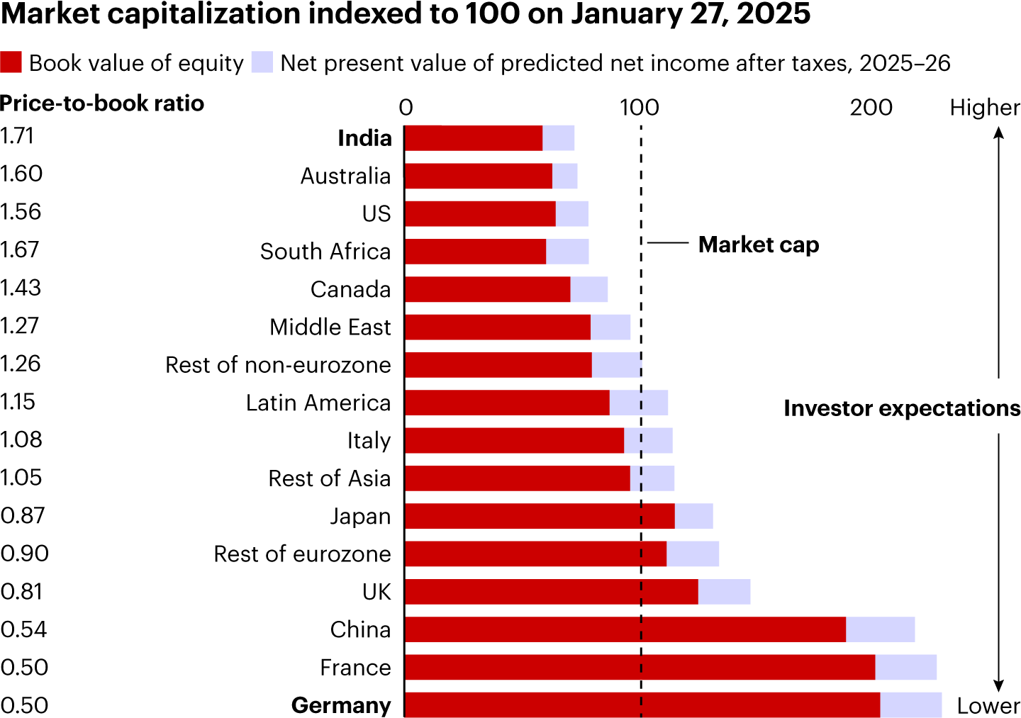 The picture is different in other regions, particularly India, Australia, and North America. There, investors tend to see more “white space” in future earnings potential (see Figure 1).