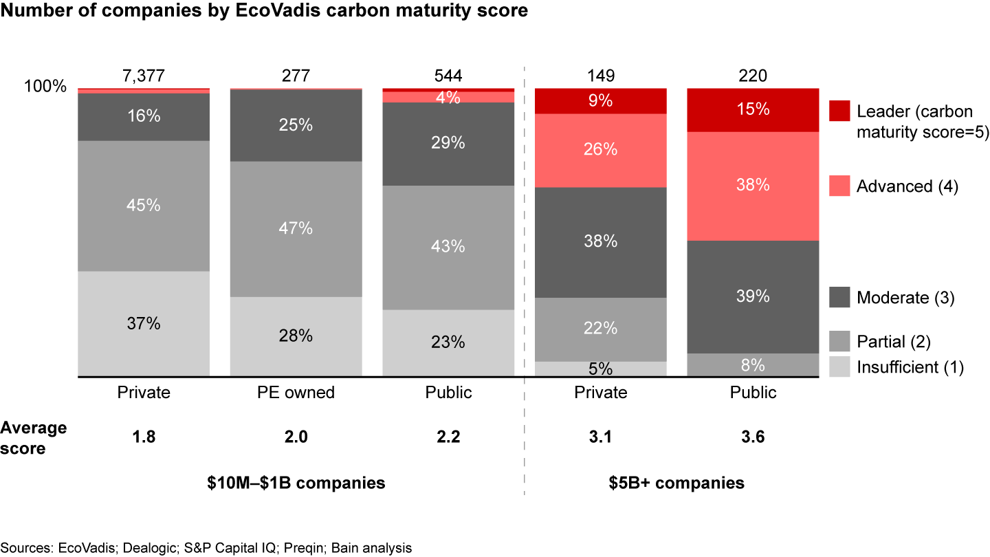 Until now, private companies have faced less pressure to adopt carbon-reduction strategies than their public counterparts. This explains why data from EcoVadis, the world’s leading supplier of business sustainability ratings, in which Bain has an investment, shows that 53% of large public companies achieve top scores for carbon management while only 35% of large private companies do (see Figure 3).