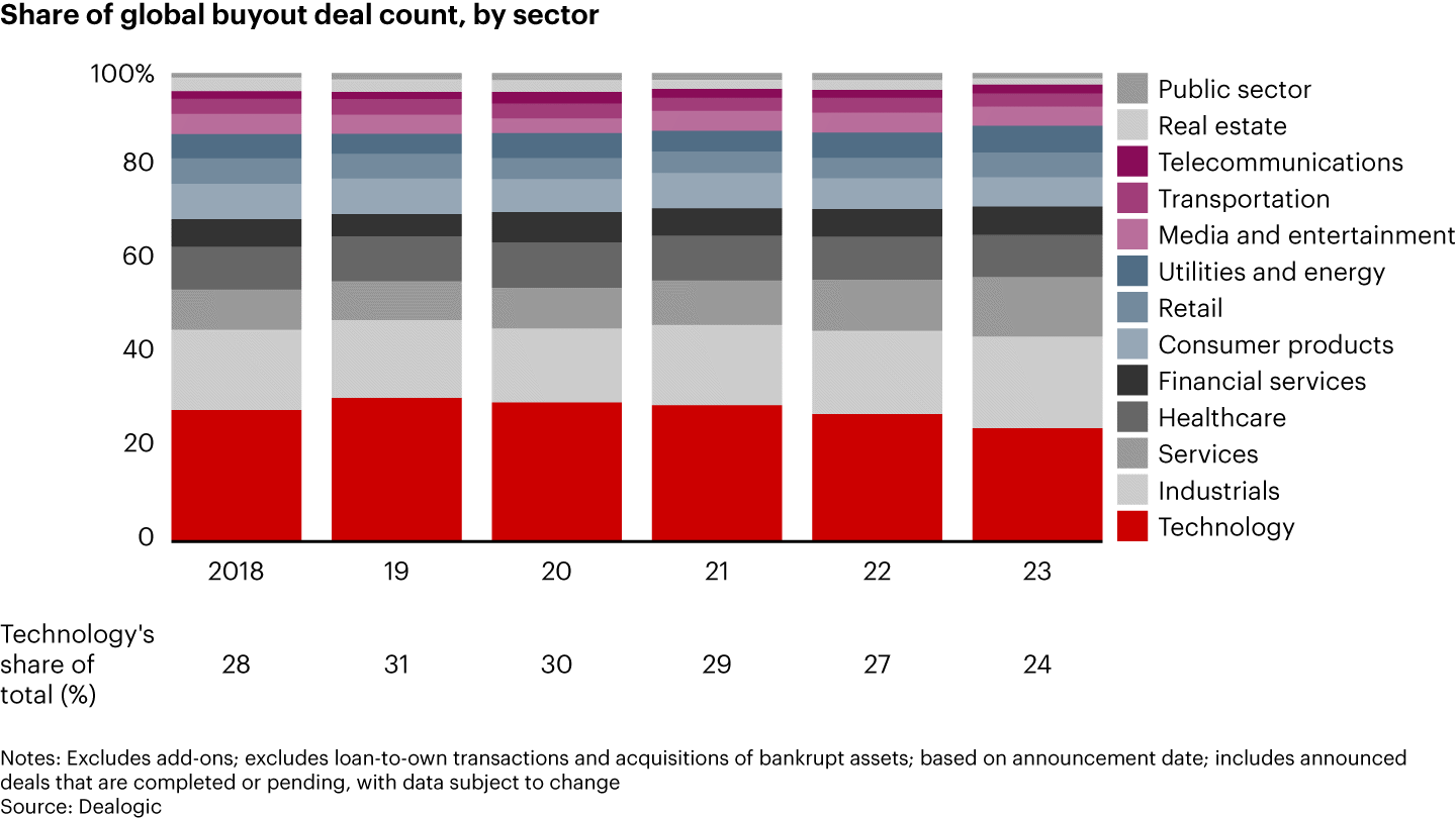 The lack of affordable leverage cut the number of megadeals—those over $5 billion—by almost half, and the average deal size dropped to $788 million, down from the peak of $1 billion in 2021. Buyouts broadly saw double-digit declines in deal count (see Figure 7). Technology deals, which by nature require less leverage than deals in other sectors, maintained their dominant share of total buyout count, but asset-heavy traditional industries like industrial goods and services expanded their share slightly, benefiting from a flight to safety among investors looking for stability wherever they could find it (see Figure 8).