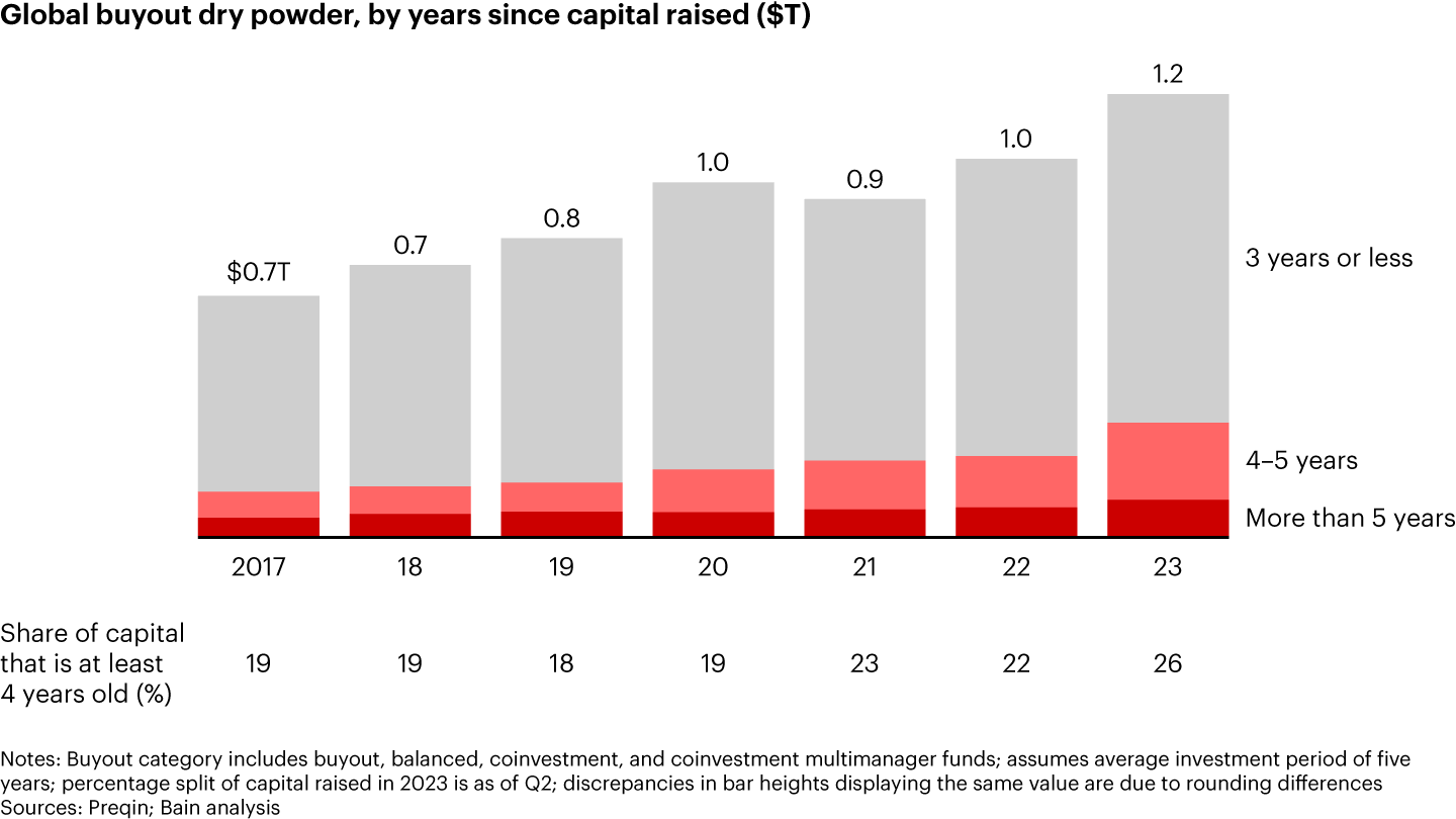 The good news, as we said earlier, is that some moderation is likely on its way in 2024 as inflation stabilizes and central bankers try their best to bring the global economy to a soft landing. Barring further shocks, a more stable—even favorable—outlook will help GPs get more comfortable with what they are underwriting. The level and age of the dry powder in their funds is also creating a heavy incentive to get moving. The industry is sitting on an unprecedented $3.9 trillion in unspent capital, the largest share of it ($1.2 trillion) in buyout funds (see Figure 13). The slowdown in dealmaking has also increased the average age of that buyout capital; around 26% of it is four-plus years old and aching to be deployed.