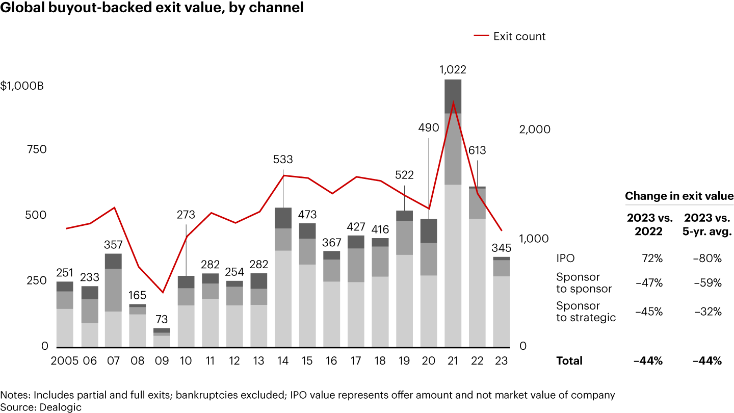 While corporate buyers remained the largest channel—accounting for nearly 80% of total exit value in 2023—the value of these strategic deals fell off 45% from 2022, to $271 billion. This was part of a broad corporate mergers and acquisitions pullback in 2023 as harried executives tried to make sense of rising rates and the uncertain macro environment.