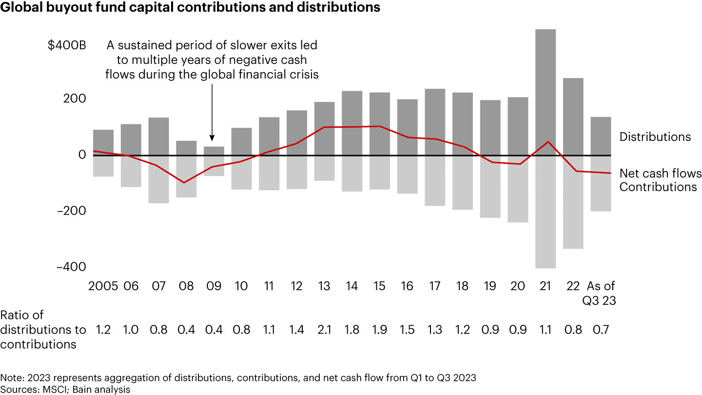 It’s also true that the pace of drawdowns from recent fund vintages has been rapid by historical standards, largely because of the post–Covid-19 boom in dealmaking. On a normalized basis (accounting for the difference in industry size), drawdowns from 2020–21 buyout fund vintages are tracking the 2006 vintage, which had the steepest pace of outflows in the industry’s history and an abnormally slow payback period amid the post-GFC recession.