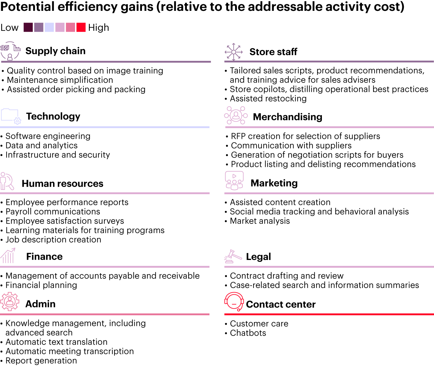 Less obviously, the support needed from HR and contact center teams fell. AI tools also have huge potential to reduce maintenance team calls by empowering store associates to resolve more problems themselves. The promise of wide-ranging benefits such as these across multiple projects is one reason we think the available generative AI–related efficiency gains across many functions could amount to as much as 20% at some retailers.