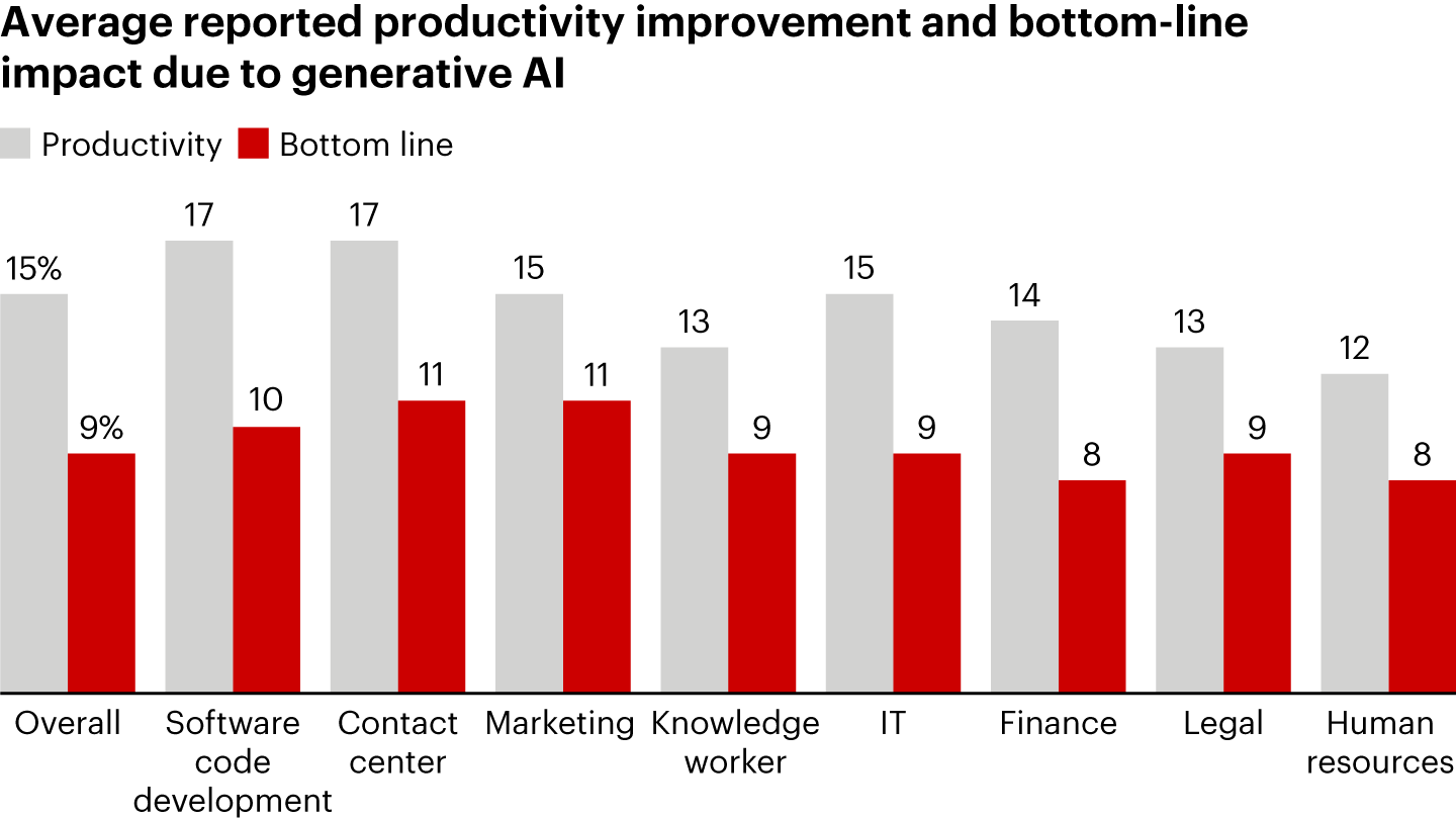 - Generative AI could cut the cost of some support functions by as much as 20% and lower cost of goods sold by 1–2 percentage points.